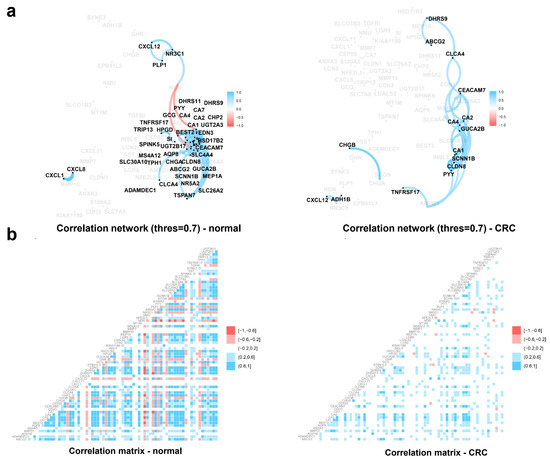 Correlation analysis of biomarker candidates of cancer samples and non-cancerous samples. (a) Correlation network of biomarkers in cancer samples and non-cancerous samples. Blurred edges in the network were the ones with correlation strength (in absolute value) below the cut-off value 0.7. The blue color indicates positive correlations while red color indicates negative correlations (b) Correlation matrix of biomarkers in cancer samples and non-cancerous samples.