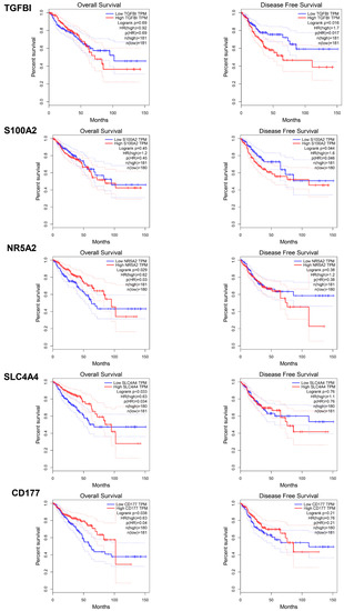 Overall survival and disease-free survival analysis of TGFBI, S100A2, NR5A2, SLC4A4, and CD177.