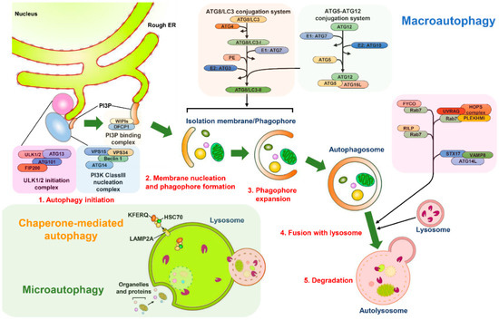 Autophagy undergoes a stepwise process for vacuole biogenesis that involves the initial nucleation and elongation of the isolation membrane (IM)/phagophore, the closure of autophagosomes, and the fusion of autophagosomes with lysosomes to form autolysosomes (Figure 1) [111,112,113]. Numerous organelles [112,113,114], including the ER [115,116], Golgi apparatus [117], mitochondria [118], recycling endosome [119,120], plasma membrane [121], and mitochondria-associated ER membrane (MAM) [122] support the membrane source for the emergence of the IM/phagophore. At the initial stage, the IM/phagophore that originates from a particular membrane structure, which is often derived from the ER, expands to form a double-membraned and enclosed autophagosome (Figure 1) [114,123,124,125]. Subsequently, mature autophagosomes fuse with the lysosome to generate autolysosomes in which the interior materials are degraded by lysosomal proteases (Figure 1) [124,126,127,128].