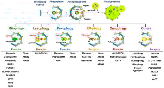 Different modes of selective autophagy. Degradation of selective autophagy involves the specific interactions between the ATG8/LC3-interacting regions (LIRs) within cargo receptors and ATG8/LC3 located onto autophagosomal membrane. The ubiquitination of degradative cargos or associated ligand proteins is often required for recognition by cargo receptors. Selective autophagy has been shown to eliminate different kinds of organelles and proteins, including damaged mitochondria (mitophagy), injured lysosomes (lysophagy), damaged peroxisomes (pexophagy), stressed ER (ER-phagy), and infectious pathogens (xenophagy), through specific cargo receptors in yeast and mammalian cells as indicated. Also, lipid droplets (LDs) ferritin, nuclei, ribosomes, and protein aggregates are also degraded by selective autophagy via the identified cargo receptors and other unknown adaptor proteins.