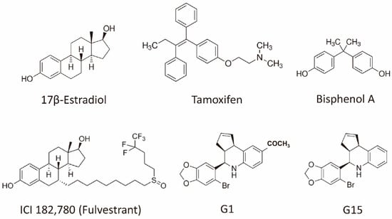 Structures of the representative GPER agonists and antagonists. 17β-estradiol is one of the major physiological forms of estrogen. Tamoxifen is both a selective estrogen receptor modulator and an agonist for the GPER. Bisphenol A is a xenoestrogen. Fulvestrant is a selective estrogen receptor downregulator (ER antagonist) and an agonist for the GPER. G-1 is a selective GPER agonist, whereas G15 is a selective GPER antagonist. Abbreviation: ER, estrogen receptor; GPER, G-protein coupled estrogen receptor.