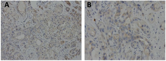 Representative case of archival, paraffin-embedded breast ductal carcinoma stained with polyclonal GPER1 antibody (Sigma-Aldrich, 1:50 dilution) showed focal, weak membranous and cytoplasmic expression. (A) original × 200; and (B) original × 400.