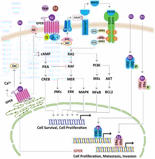 - Filardo, E.J.; Quinn, J.A.; Bland, K.I.; Frackelton, A.R., Jr. Estrogen-induced activation of Erk-1 and Erk-2 requires the G protein-coupled receptor homolog, GPR30, and occurs via trans-activation of the epidermal growth factor receptor through release of HB-EGF. Mol. Endocrinol. 2000, 14, 1649–1660. [Google Scholar] [CrossRef] [PubMed]