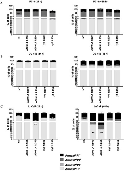 Effects of A009 (L4) on PC-3, DU-145 and LNCaP apoptosis. Apoptosis (24 and 48 h) was assessed by flow cytometry on PC-3 (A), DU-145 (B), and LNCaP (C) human prostate cancer cells. Induction of specific apoptosis phases was detected by gating annexin V−/PI− cells (viable), annexin V+/PI− cells (early apoptotic), annexin V+/PI+ cells (late apoptotic) and annexin V−/PI+ cells (dead). EtOH diluted (1:500 and 1:250) in complete RPMI was used as control vehicle for HyT, with no effects on induction of apoptosis (data not shown). Results are shown as mean ± SEM, ANOVA, ** p < 0.01, *** p < 0.001.