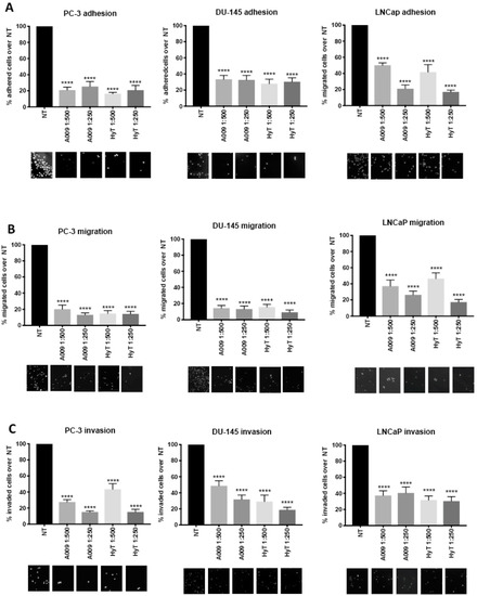 We investigated the adhesion capabilities of PC-3, DU-145, and LNCaP human PCa cells, which were pre-treated for 24 h with A009 or HyT (1:500, 1:250). A009 significantly prevented PC-3, DU-145, and LNCaP adhesion (Figure 3A). A comparable effect was observed when cells were treated with HyT (Figure 3A). EtOH diluted (1:500 or 1:250) in complete RPMI was used as control vehicle for HyT, with no effects on cell adhesion [19].