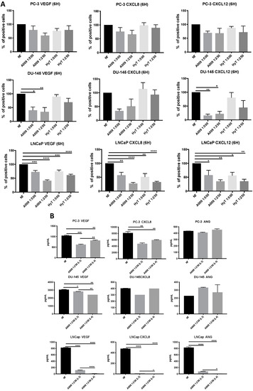 We investigated whether the A009 extracts were effective in limiting the release of pro-angiogenic factors in PC-3, DU-145, and LnCaP PCa cell lines. FACS analysis showed decreased production of VEGF, CXCL8, and CXCL12 by the three PCa cell lines, exposed to A009 at 1:500 and 1:250 dilutions, following 6 h of treatment (Figure 4A,B). HyT inhibitory effects were lower in the three PCa cell lines as compared to those exposed to the same dilutions of A009.