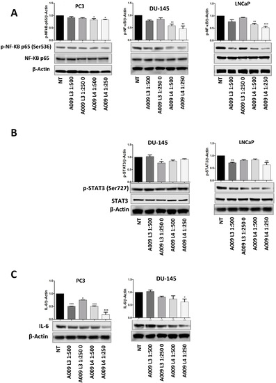 Effects of A009 on NF-κB, IL-6, and STAT3 production and activation in human prostate cancer cells. PC-3, DU-145, and LNCaP cells were treated for 24 h with A009 (L3 and L4, dilution 1:250, 1:500). (A) Effects of A009 (L3 and L4, dilution 1:250, 1:500) on phosphorylation of NF-κB (Ser536) were determined by Western blot. A009 was able to significantly lower activation of NF-κB in PCa cell lines. (B) A009 affects activation of p-STAT3 (Ser727) on DU-145 and LNCaP, and (C) downregulates IL-6 in PC-3 and DU-145 when treated with A009. Results are showed as mean ± SEM, ANOVA, * p < 0.05, ** p < 0.01.