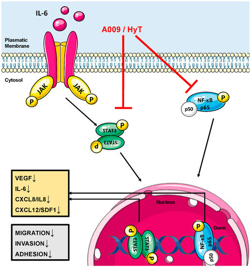 Here, we focused on the properties of the A009 and the equivalent HyT concentration by investigating the capabilities to block PCa cell aggressiveness in vitro, and analyzed the cellular mechanisms involved, in a potential chemopreventive approach. We showed that the tested extracts inhibit cytokines involved in angiogenesis by reducing the release of pro-angiogenic factors: VEGF, CXCL8, and CXCL12. Furthermore, A009 blocked the pro-inflammatory pathways NF-κB and IL-6/STAT3.