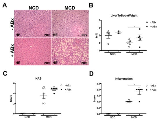 To investigate the relevance of gut microbiota for the development and progression of MCD induced steatohepatitis, 8 weeks old male mice were fed a methionine choline-deficient (MCD) diet for 8 weeks. One group of mice received a well-established cocktail of four non-absorbable broad-spectrum antibiotics in their drinking water, for the whole feeding experiment, while the other group of age and gender-matched mice received normal drinking water. After 8 weeks of dietary intervention, the caecum of antibiotics-treated mice was strongly enlarged. As expected, liver hematoxylin and eosin-stained liver sections of the MCD-fed mice displayed all hallmarks of NASH, including steatosis, inflammation, and fibrosis (Figure 1A). Interestingly and other than expected, antibiotic treatment (ABx) resulted in aggravated steatosis and significantly increased the inflammatory cell infiltration (Figure 1A,B). In addition, the ABx-treated mice had a higher histopathological NAFLD activity score (NAS) and a significantly higher liver-to-body weight ratio (Figure 1C,D).