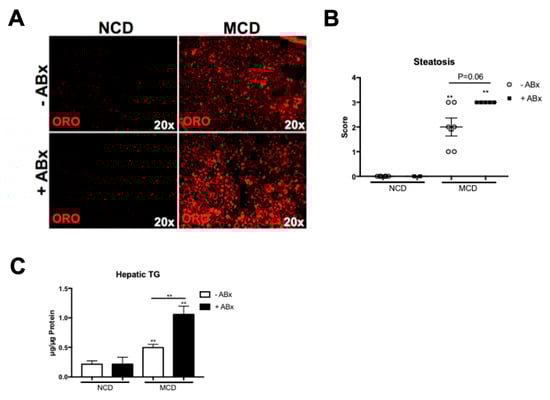 Antibiotic treatment increased the hepatic fat accumulation in the MCD-fed mice. (A) Representative Oil Red O stainings demonstrated increased the hepatic lipid accumulation upon an antibiotic treatment. (B) Steatosis score was higher in the ABx-treated mice, compared to the MCD-fed control mice. (C) Colorimetric hepatic triglyceride assay confirmed significantly increased hepatic triglycerides (TG) levels in +ABx group. Data are expressed as the mean ± SD from 2–5 mice per group and were considered significant if ** p < 0.01.