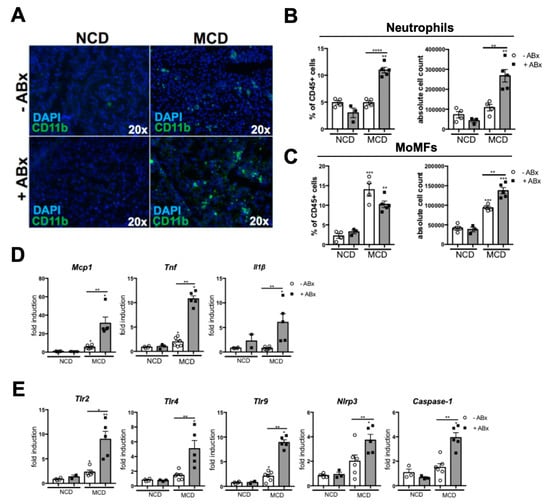 Next, we investigated the relevance of intestinal microbiota for hepatic inflammation, during the MCD-induced steatohepatitis. The Abx-treated mice demonstrated significantly higher inflammation in the histopathological analyses of the HE sections (Figure 1B). To further analyze which cell type mediated the pronounced inflammatory response, we first performed immunofluorescence staining against the CD11b. Here, CD11b+ immune cells were increased in the livers of the Abx-treated mice, compared to the MCD-fed controls (Figure 3A). To further dissect which cell type accounted for the inflammatory response, we performed a flow cytometry (FACS) analysis of the liver homogenates. MCD feeding induced a strong infiltration of the MoMFs (defined as Ly6G-, CD11bhi, F4/80low). In contrast, both, the absolute and relative numbers of neutrophil granulocytes (defined as CD11b+, Ly6G+) were only slightly increased in the MCD versus the NCD-fed mice (Figure 3B,C). While antibiotic treatment only slightly augmented the MoMF infiltration in the MCD-fed mice (Figure 3C), neutrophil granulocytes showed a significant almost two-fold increase in the MCD + ABx group, compared to the MCD−Abx group, which was reflected, both, in the absolute, as well as relative cell numbers (Figure 3B). Together, these data demonstrated that antibiotic treatment in the MCD-induced steatohepatitis triggered neutrophil infiltration.