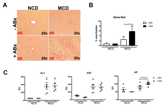 Hepatic inflammation might lead to the activation of hepatic stellate cells, which transdifferentiate into myofibroblasts-facilitating collagen deposition and, thus, contribute to tissue remodeling and disease progression towards liver fibrosis. Next, we sought to investigate whether the increased liver inflammation upon antibiotic treatment also translated into aggravated liver fibrogenesis. Indeed, the depletion of the intestinal microbiota was associated with a strong increase in liver fibrosis, as evidenced by the Sirius red stainings (Figure 4A). Histopathological quantification of collagen fibers revealed an about 2,5-fold increase in the Sirius Red positive area (Figure 4B). Serum liver transaminases Alanin-aminotransferase (ALT) and aspartate-aminotransferase (AST) were both significantly increased after 8 weeks of the MCD treatment. While AST and ALT did not increase upon antibiotic treatment, alkaline-phosphatase (AP) levels were higher in the +Abx group, compared to the MCD-fed control animals (Figure 4C). In sum, these data showed that antibiotic treatment prompted excessive liver fibrosis in the experimental MCD-induced NASH.