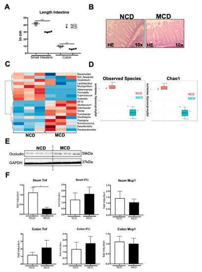 Steatohepatitis has been linked to intestinal dysbiosis. After eight weeks of MCD feeding, the small intestines, as well as the colons, were atrophic and significantly shorter than those of the NCD-fed control mice (Figure 5A). This phenotype was also reflected in the HE histology, which demonstrated a shortening of the intestinal villi in the duodenum of the MCD-fed mice (Figure 5B). To investigate the microbiota composition, we collected cecal microbiota samples to isolate the metagenomic DNA and performed a 16s ribosomal gene (rDNA) amplicon sequencing of the V1–V3 hypervariable region, using the 454 platform. Eight weeks of MCD treatment resulted in marked alterations in the microbiota composition (Figure 5C). Among the genera that were differentially regulated between the NCD- and MCD-fed mice, we identified a decrease in the potentially probiotic Lactobacillus, as well as Akkermansia, and an increase in the Ruminococus, which has been linked to liver fibrosis (Figure 5C) []. Along with changes in the individual bacterial communities, MCD feeding resulted in a strong overall decrease of the microbiota alpha diversity metrics, such as observed species, as well as Chao1 (Figure 5D). Although MCD feeding induced changes in the microbiota composition and a loss of species richness, we did not observe a major decrease in the Occludin tight junction expression in the ileum of the MCD-fed mice (Figure 5E). While the mRNA expression of Tnf in the ileum was even significantly decreased upon MCD feeding, other inflammatory genes, including the Il1b and Mcp1 were unaffected, both in the ileum and the colon (Figure 5F).