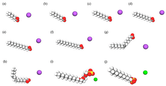 Structures of the fatty acid potassium molecules and synthetic surfactant detergents. (a) Potassium caprylate (C8K); (b) potassium caprate (C10K); (c) potassium laurate (C12K); (d) potassium myristate (C14K); (e) potassium palmitate (C16K); (f) potassium stearate (C18K); (g) potassium oleate (C18:1K); (h) potassium linoleate (C18:2K); (i) SLES; and (j) SLS. Carbon: gray, hydrogen: white, oxygen: red, sulfur: yellow, potassium ions: purple, sodium ions: green