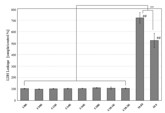 LDH leakage of NHEK-Ad cells treated with 0.5 mM fatty acid potassium, SLES, or SLS for 5 min. Untreated cells were used as the control. The percentage LDH leakage was calculated relative to the control value. Results are expressed as mean ± standard deviation (SD) values (n = 8). ** p < 0.01; ## p < 0.01 compared to the control.