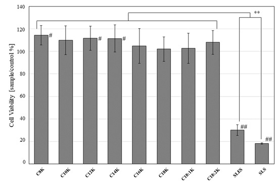 Viability of BALB/3T3 cells that were cultured in Dulbecco’s modified Eagle’s medium (DMEM) for 24 h after they had been treated with 0.5 mM fatty acid potassium, SLES, or SLS for 5 min. Untreated cells were used as the control. Percentage cell viability was calculated relative to the control value. Results are expressed as mean ± SD values (n = 8). ** p < 0.01, # p < 0.05 and ## p < 0.01 compared to the control.