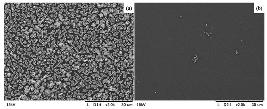Scanning electron microscopy. Scanning electron microscopy micrographs of the untreated (a) and C18:1K-treated (b) biofilms that formed on the test pieces (2000×). MRSA biofilms formed on the test pieces after they had been incubated for 24 h at 37 °C. The MRSA biofilms that formed on the test pieces were removed by C18:1K. (a) An untreated biofilm that formed on a test piece; (b) A biofilm that had been treated with C18:1K for 1 min.