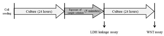 Cytotoxicity test procedure for the BALB/3T3 cells. BALB/3T3 cells that had been cultured in DMEM for 24 h were treated with 100 mL/well of each sample for 5 min. The solution was collected from each well and used for the LDH leakage assay. After the cells had been cultured for 24 h, their viability was assessed.