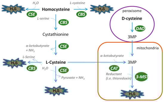 The kidney possesses all four of the H2S biosynthesis pathways (Figure 1), indicating the abundance of this gaseous molecule in the organ. Briefly, CSE leads to the generation of H2S by a two-step reaction, first dimerizing l-cysteine into thiocytsteine and then using it to react with other thiols to produce H2S. CBS can directly catalyze l-cysteine and homocystenin into H2S along with cystathinine. In contrast, 3-mercaptopyruvate has to be generated by CAT, after which 3-MST can use it as a substrate to produce pyruvate and H2S. Unlike CSE and CBS, 3-MST is mainly located in mitochondria and therefore regulates mitochondrial homeostasis of H2S. A fourth H2S generation pathway was recently discovered by Kimura’s group, in which d-cysteine serves as a substrate to produce H2S by d-amino acid oxidase coupled with 3-MST. For a detailed portrayal of H2S biosynthesis, it is advisable to refer to several excellent reviews published elsewhere [9,10,11]. It is worth mentioning that compared with its counterparts, the role of 3-MST is currently not well appreciated in either kidney physiology or disease in spite of its special role in producing H2S in mitochondria. This is an intriguing area warranting further exploration.
