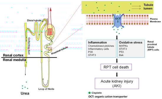 After decades of studies, the pathophysiology underlying cisplatin nephrotoxicity has gradually been elicited. In this section, the possible signaling and molecular mechanisms underlying the disease pathophysiology are summarized and illustrated in Figure 3.