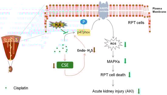 The production of H2S is precisely controlled in the kidney by an enzymatic system. Nevertheless, changed expression levels of these H2S-producing enzymes were often found in various pathological conditions, which leads to altered levels of endogenous H2S [9,70]. Intriguingly, the alteration contributes to the progression of diseases such as renal ischemic–reperfusion injuries and diabetic nephropathy [9,70], perhaps due to significant roles of H2S not only in renal physiology but also in the maintenance of cellular homeostasis [14,71]. Although previous evidence suggests the reduced mRNA levels of CSE and CBS [72], whether and how this reduction influences the pathogenesis remains largely unexplored. We recently demonstrated the reduction of endogenous H2S levels due to the reduced protein level of CSE, but not CBS, upon cisplatin treatment [73]. Interestingly, antioxidant-like N-acetylcysteine (NAC) can almost completely abolish cisplatin-mediated CSE downregulation, consistent with a previous study showing that oxidative stress results in reduction of CSE [3]. Furthermore, the data also found that production of endogenous H2S is protective against cisplatin-induced RPT cell death, by overexpression of CSE or addition of H2S-producing substrates in RPT cells [73]. These results suggest that reduction of endogenous H2S may contribute to cisplatin-induced RPT cell injury (Figure 4). Nevertheless, further studies, such as examination of whether CSE deficiency worsens cisplatin-induced nephrotoxicity in animals, may be required to consolidate this conclusion. Moreover, how the reduction of endogenous H2S influences the disease progression may also need exploration in the future.