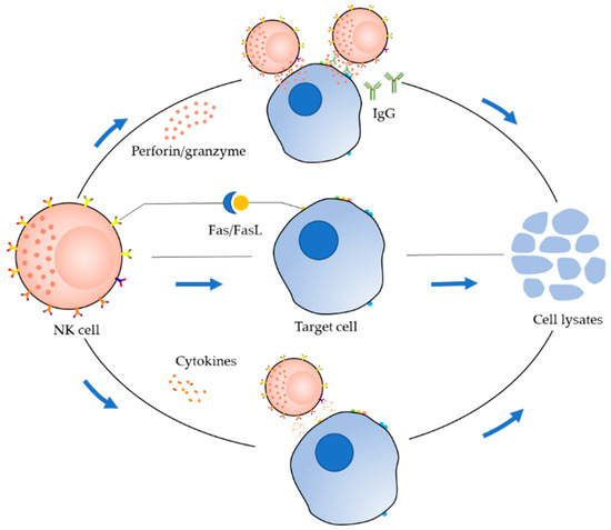 Activated NK cells exert cytotoxic effects mainly through three pathways (Figure 2). The first pathway is the perforin/granzyme pathway [9]. In this pathway, granzymes and perforin stored in the cytoplasmic granules of NK cells are released by activated NK cells together into the intercellular space. The structure of perforin is similar to that of complement, which can form a transmembrane channel directly on the target cell membrane, resulting in increased permeability of the cell membrane and ultimately causing osmotic lysis of the target cell. The perforation channel formed by perforin facilitates the entry of granzyme into the target cell. Additionally, perforin causes redistribution of granzymes in the cytoplasm and nucleus of target cells, allowing granzymes to accumulate at the cleavage site; this promotes the lysis of target cells and ultimately apoptosis. The second pathway is the Fas/FasL pathway [21,22]. The Fas molecule, also known as Apo-1 or CD95, is a type-Ⅰ transmembrane protein, and Fas ligand (FasL or CD95L) is a type-Ⅱ transmembrane protein that belongs to the TNF family. When FasL binds to Fas, Fas can deliver a “death signal” to the cell, and the target cell then undergoes apoptosis within a few hours. In the third pathway, the cytokine pathway, NK cells secrete cytokines, e.g., TNF-α [9], which can alter the stability of lysosomes in target cells, leading to leakage of various hydrolases, affecting cell membrane phospholipid metabolism, and activating target cell endonuclease to degrade genomic DNA.