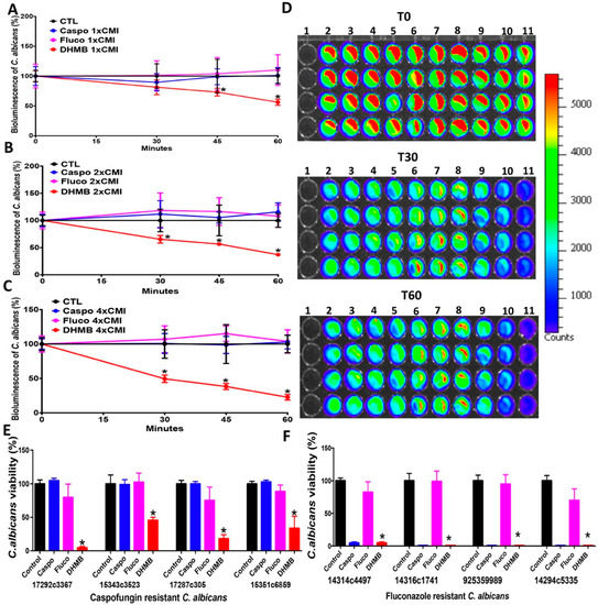 | Bioluminescent C. albicans | C. albicans strain CAI4 (ura3::imm434/ura3::imm434) | 0.03 | 0.5 | 8 | [26] |
