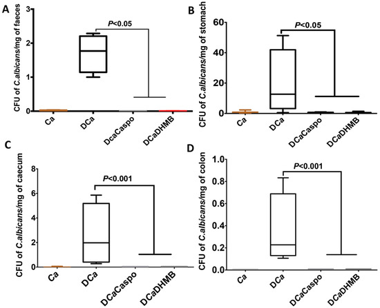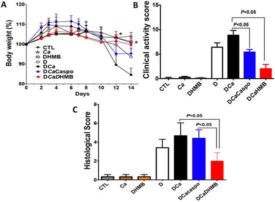 2.3. Effect of DHMB on C. albicans Colonisation and Intestinal Inflammation in DSS-Induced Colitis Model