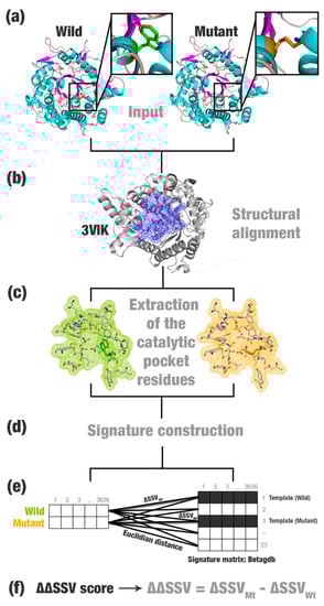 Figure 1. The structural signature variation (SSV) schema. (a) SSV receives as input PDB files containing mutant and wild protein (in this example, a β-glucosidase enzyme). (b) The structures are structurally superposed to a template (Neotermes koshunensis β-glucosidase; PDB ID: 3VIK). (c) The corresponding residues of the catalytic pocket in the wild, mutant, and their templates’ structures are extracted. (d) Structural signatures for all files are computed using the aCSM (atomic Cutoff Scanning Matrix) algorithm. (e) The Euclidean distance is computed for every line of the templates’ signature matrix. The lowest values define the templates for wild and mutant. (f) The difference between the two distances (ΔΔSSV) is calculated. - Structural signature construction: For every PDB file, we compute a vector with the cumulative distribution of the pairwise distances among all pairs of atoms and their physicochemical proprieties (aCSM algorithm) (Figure 1d).