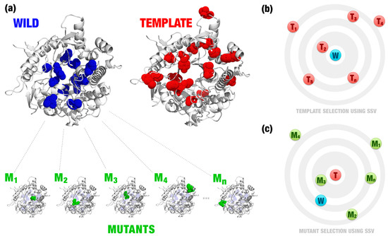 (a) Wild and template have a similar folding, but differences in the sequence (illustrated by blue dots in the wild enzyme and by red dots in the template enzyme). Several point mutations were proposed for the wild enzyme (green dots). The template enzyme is defined based on a curated database of enzymes with desired characteristics (in this case study, Betagdb). For instance, in (b) the template, T2 was defined as the template (T) for the wild enzyme (W). SSV is illustrated by a two-dimensional visualization in (b) and (c). Euclidean distances between signatures of the wild/mutants and the template (signature variation) are used to define the best template (b) and mutant (c). In this example, the mutant, M3, was defined as the mutation that best inserts characteristics similar to the template (c). Images generated using PyMOL software (http://pymol.org).