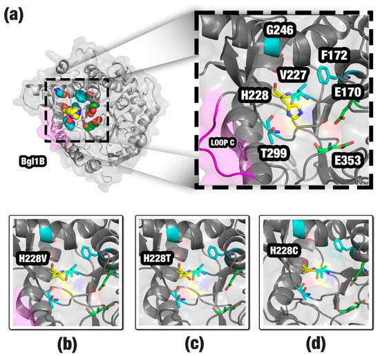 Structure of Bgl1B (a), sites pointed by SSV as a target for mutations: H228 residue (yellow); F172, V227, G246, and T229 (cyan). The catalytic residues (E170 and E353) are shown in green. Additionally, loop C is in magenta. For comparison, we highlighted the mutations, H228V (b), H228T (c) and H228C (d), considered by the literature as being responsible for glucose tolerance. Images generated using PyMOL software (http://pymol.org).