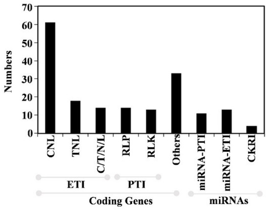 - Meyers, B.C.; Kozik, A.; Griego, A.; Kuang, H.; Michelmore, R.W. Genome-wide analysis of NBS-LRR-encoding genes in Arabidopsis. Plant Cell 2003, 15, 809–834. [Google Scholar] [CrossRef]