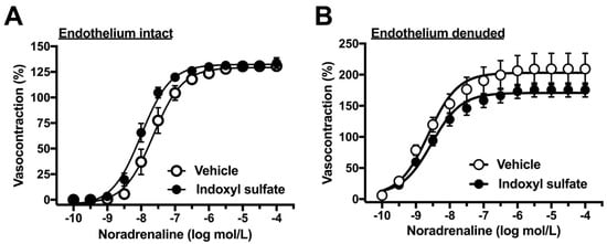 Concentration–response curves for noradrenaline-induced vasocontractions in endothelium-intact (A) or -denuded (B) aortas in the absence (vehicle) and presence of indoxyl sulfate (10−4 mol/L). The ordinate shows vasocontraction as a percentage of 80 mmol/L high-K+-induced vasocontraction. Data are presented as means ± standard error of mean (SEM) values from six experiments.