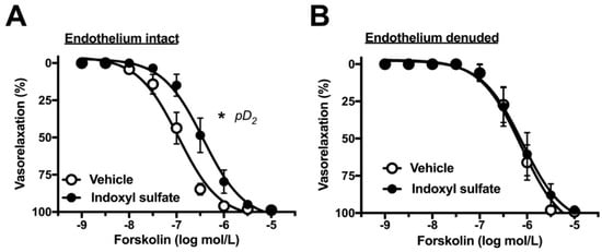 Concentration–response curves for forskolin-induced vasorelaxations in endothelium-intact (A) or -denuded (B) aortas in the absence (vehicle) and presence of indoxyl sulfate (10−4 mol/L). The ordinate shows vasorelaxation as a percentage of PE-induced vasocontraction (0% being defined as the plateau level of precontraction). Data are presented as mean ± standard error of mean (SEM) values seven (A) or eight (B) experiments. * p < 0.05, vs. vehicle; a negative logarithm of EC50, which is the molar concentration of agonist producing 50% of the Emax (pD2).