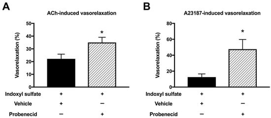 It has been reported that indoxyl sulfate affects cellular function by transporting into the cells via an organic anion transporter [13,36,37]. Therefore, we studied the effect of an organic anion transporter inhibitor on the endothelium-dependent vasorelaxations in indoxyl sulfate-treated aortas. As shown in Figure 7, probenecid (10−3 mol/L) enhanced the vasorelaxations induced by ACh (3 × 10−7 mol/L) (Figure 7A) or A23187 (10−7 mol/L) (Figure 7B) in aortas treated with indoxyl sulfate.