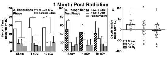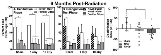 In order to address NASA’s questions regarding the effects of space radiation on humans, animal studies using charged particles, as opposed to electromagnetic radiation, are necessary. Even though HZE ions comprise a small portion of the total radiation dose hypothesized for an astronaut in deep space (~20–70 cGy), they are densely ionizing and produce distinct biological effects when compared to sparsely ionizing and low LET radiation, such as X-rays [,]. While numerous animal studies have shown that significant and long-term neurobehavioral impairments occur following exposure to protons and HZE ions [,,,,,,,,,,,,,], several cognitive domains important for astronaut health and well-being remain relatively unexplored. Social cognition is one such domain and is important for humans working in groups, especially in the confined and isolated environment of long-duration space flight. One of the most widely used tests to assess deficits in social cognition is the social preference/recognition memory test, where a subject rodent must differentiate between socially relevant objects (e.g., a live rodent and an inanimate object, two live rodents, or olfactory cues from different rodents) [,]. When allowed to freely explore these stimuli, rodents typically spend a greater percentage of time exploring novel stimuli during these tests and they also display a predictable pattern of habituation to these stimuli. For example, normal rodents interact more with an unfamiliar conspecific or the conspecific’s olfactory cues, as opposed to a familiar conspecific. There are several variations of this test, with the stimuli being live rodents or objects impregnated with the odors of conspecifics (e.g., soiled bedding, urine-soaked paper, wooden beads) []. We have used a variation of this test [,], termed the Social Odor Recognition Memory (SORM) test, where the subjects initially show exploration time differences between self-odors and a novel conspecific’s odor during “Habituation”, and an additional novel conspecific’s odor on the following “Recognition Test” [,,]. Decreased preference for the first novel odor on the latter Recognition Test, experienced during Habituation 24-h earlier, is indicative of a social recognition memory deficit.
