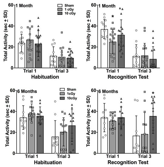 Mean total seconds of exploration on Trials 1 and 3 for Habituation and the Recognition Test at one month (top panels; n = 12–16) and six months (bottom panels; n = 10–13) following exposure. No differences were found among the groups during Habituation at either time point. At one month following exposure, 1 cGy rats had significantly less exploration on Trial 1 of the Recognition Test compared to sham control rats (* p ≤ 0.05). At six months, the 10 cGy rats had significantly greater exploration on Trial 3 of the Recognition Test compared to both sham controls and 1 cGy exposed rats (* p ≤ 0.05). Bars represent group averages and symbols represent individual animals.