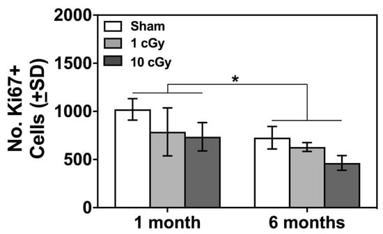 Mean number of Ki67+ cells in the subventricular zone (SVZ) of sham (n = 2–4), 1 cGy (n = 3–5), and 10 (n = 3–5) cGy-exposed rats. The number of Ki67+ cells was significantly greater when measured at one month following exposure compared to six months following exposure (* p < 0.05).