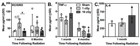 Plasma cytokine levels in sham control (n = 2–4), 1 cGy (n = 3–5), and 10 cGy (n = 3–5) exposed rats measured either one month or six months following exposure. (A) Mean plasma KC/GRO levels (pg/ml) were significantly greater in the 1 cGy group at one month following exposure compared to the 10 cGy group (* p = 0.05) and trended towards significance compared to the sham controls (p = 0.07). (B) Mean plasma TNF-α levels were unaffected by radiation exposure. (C) Mean plasma IL-6 levels did not differ among the groups at one month following exposure.