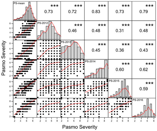 Dot plots (lower triangle), histograms (diagonal) and Pearson correlations (upper triangle) between six pasmo severity datasets. Best curves are fitted in dot plots and histograms. *** represents significance at the <0.001 probability level.