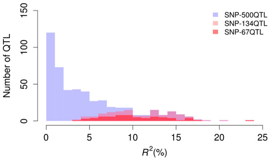Distribution of R2 (%) (phenotypic variation explained by individual QTL) in the three QTL marker sets.