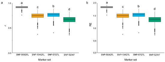 Accuracy (r) (a) and relative efficiency (RE) (b) of RR-BLUP prediction models built with combinations of four marker sets using the five-year average PS dataset (PS-mean) and random five-fold cross-validations. Letters above box plots indicated statistical significance (p < 0.05) for r and RE among marker sets.