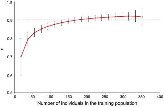 Relationship between the genomic prediction accuracy (r) and the size of the training population based on the SNP-500QTL marker set, the PS-mean dataset and the RR-BLUP models. The dash line represents a prediction accuracy of 0.9.