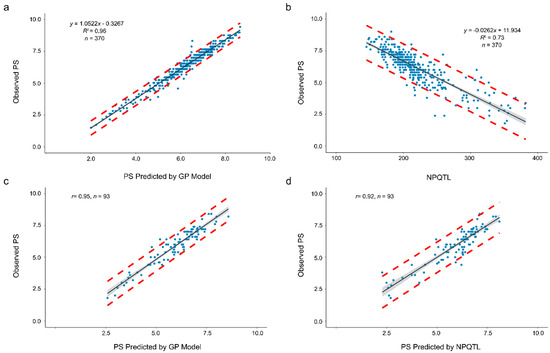 NPQTL in the 370 accessions for the 500 QTL set was tallied. Significant linear correlation between PS-mean and NPQTL (r = 0.86 or R2 = 0.73) was observed (Figure 5b). This correlation was less than but close to the accuracy of the GP model with SNP-500QTL and higher than the GP models using other marker sets (Table 3). However, the single linear regression equation (y = −0.0262x + 11.934) of the observed PS (y) to NPQTL (x) had a large standard deviation for each prediction value, with an average prediction interval width of 2.70, nearly three times the average prediction interval width of the GP model; that is, the NPQTL model had a higher prediction error than the GP model.