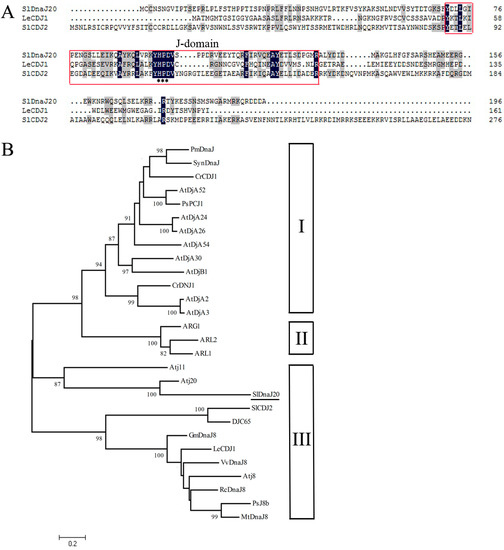 Multiple sequence alignment and phylogenetic tree analysis of Solanum lycopersicum DnaJ protein (SlDnaJ20). (A) Multiple sequence alignment between SlDnaJ20 and other J-proteins in tomato. Black and gray refer to identical and similar amino acids, respectively. The His/Pro/Asp (HPD) motifs are marked by stars. The protein sequence of SlDnaJ20 only contains a J-domain (red box). (B) Phylogenetic tree analysis of SlDnaJ20 with other J-proteins. Roman numerals I–III on the right represent different types of J-proteins. SlDnaJ20 is underlined. The phylogenetic tree of various J-proteins generated with the ClustalW2 program using the Neighbor-Joining method in MEGA (version 5.1) (https://mega.software.informer.com/5.1b). Bootstrap analyses were computed with 1000 replicates, the percentage values larger than 80 are shown in the branches. The gene names and GenBank accession numbers are as follows: PmDnaJ, YP_001013845; SynDnaJ, ZP_01084411; CrCDJ1, AAU06580; AtDjA52, AAD55483; PsPCJ1, CAA96305; AtDjA24, NP_568076; AtDjA26, NP_565533; AtDjA54, NP_188410; atDjA30, BAB11067; AtDjB1, At1g28210; CrDNJ1, EDP04706; AtDjA2, At5g22060; AtDjA3, At3g44110; ARG1, AEE34786; ARL2, At1g59980; ARL1, At1g24120; AtJ11, At4 g36040; AtJ20, At4g13830; SlDnaJ20, XM_004239806; SlCDJ2, AK323942; DJC65, At1g77930; GmDnaJ8, ACU18989; LeCDJ1, AK323422; VvDnaJ8, XP_002263153; AtJ8, At1g80920; RcDnaJ8, EEF49240; PsJ8b, ADL32216; and MtDnaJ8, ACJ83936.
