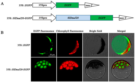 The databases TargetP 1.1 (http://www.cbs.dtu.dk/services/TargetP/) and ChloroP 1.1 (http://www.cbs.dtu.dk/services/ChloroP/) predicted that SlDnaJ20 may be a chloroplast protein (Tables S1 and S2). To confirm this prediction, transient conversion assays were conducted in vivo in Arabidopsis protoplasts extracted from leaf tissue with expressing 35S::enhanced GFP (EGFP) and 35S::SlDnaJ20-EGFP fusion protein (Figure 2A). As a contrast, not surprisingly, the green fluorescence of 35S::EGFP protein was dispersed in all parts of the protoplasts except the vacuoles (Figure 2B, upper panels). However, when the protoplasts were transfected with 35S::SlDnaJ20-EGFP fusion protein, green fluorescence signal was distinctly co-localized with the auto-fluorescent signal of chlorophyll in the chloroplasts (Figure 2B, lower panels). These results indicated that SlDnaJ20 is a chloroplast protein.