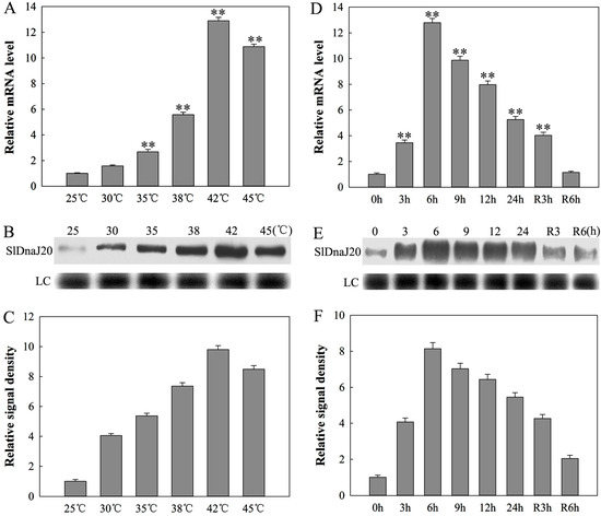 SlDnaJ20 was obtained from a gene tomato library whose gene expression patterns could be affected by heat stress. Therefore, the expression of SlDnaJ20 under heat stress was studied firstly via qPCR and Western blot methods. SlDnaJ20 transcription levels were analyzed using qPCR at different temperatures (30 °C, 35 °C, 38 °C, 42 °C, and 45 °C) after 6 h of heat treatment. The expression of SlDnaJ20 was the highest after the 42 °C treatment (Figure 3A). Therefore, the expression levels of SlDnaJ20 during the study were determined with 42 °C for 24 h (Figure 3D). The transcription level reached its maximum at 6 h, which then decreased but recovered slowly to the original level after recovery at 25 °C for 6 h. Western blot results suggested that the change in protein signals of SlDnaJ20 was similar to that in the transcription levels (Figure 3B,E). Similarly, quantitative image analysis of SlDnaJ20 protein contents (Figure 3B,E) showed a similar profile (Figure 3C,F).