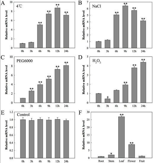 Quantitative PCR analysis of the expression profiles of SlDnaJ20 in tomato: (A) 4 °C, (B) 250 mM NaCl, (C) 20% polyethylene glycol (PEG), (D) 10 mM H2O2, (E) control, (F) expression of SlDnaJ20 in different tomato tissues. The mean values ± SD of at least three replicates are presented, and * p < 0.05 and ** p < 0.01 indicate significant differences compared with the control.