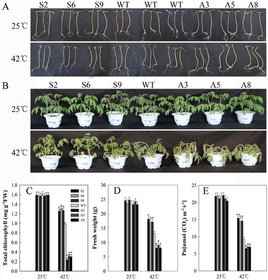Heat tolerance of ten-day-old seedlings and six-week-old plants. (A) Phenotype of ten-day-old seedlings under 25 °C and 42 °C for two days; (B) phenotype of six-week-old plants under 25 °C and 42 °C for 24 h; (C) total chlorophyll content in grown plants; (D) fresh weight of grown plants. (E) net photosynthetic rate (Pn) in the grown plants. The mean values ± SD of at least three replicates are presented, and * p < 0.05 and ** p < 0.01 indicate significant differences compared with the control.