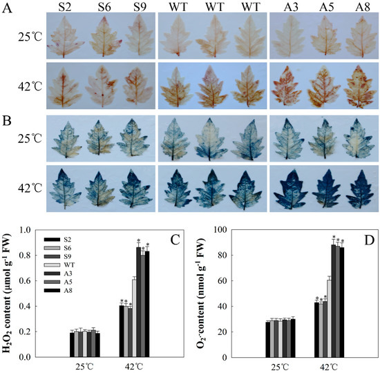 Reactive oxygen species (ROS) analysis in WT and transgenic lines: (A) 3′,3-diaminobenzidine (DAB) staining for H2O2; (B) nitroblue tetrazolium (NBT) staining for O2•−. The upper layer represents plants grown at 25 °C and the lower layer represents plants subjected to 42 °C for 12 h. (C) H2O2 content; (D) O2•− content. The mean values ± SD of at least three replicates are presented, and * p < 0.05 indicate significant differences compared with the control.